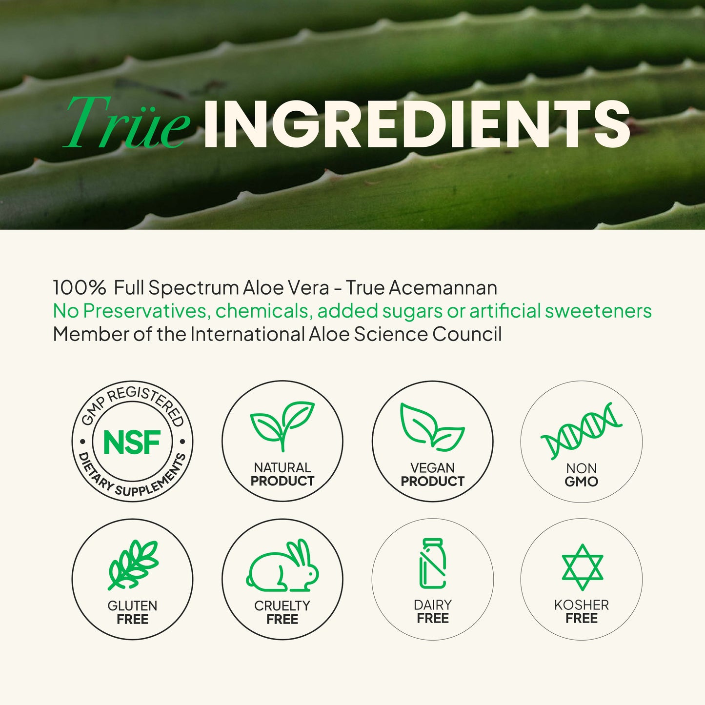 - Preserved actives: Not just True Acemannan, but LM pectin + essential sugars (the trio your body can’t get anywhere else). Preserved by our proprietary cold extraction technique.
