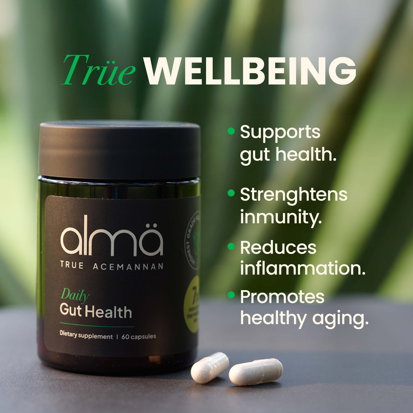 almä is a True Acemannan supplement, aloe vera’s most powerful compound for gut, immune, and healthy aging support. Purity verified in every batch and preserved bioidentical to the plant.